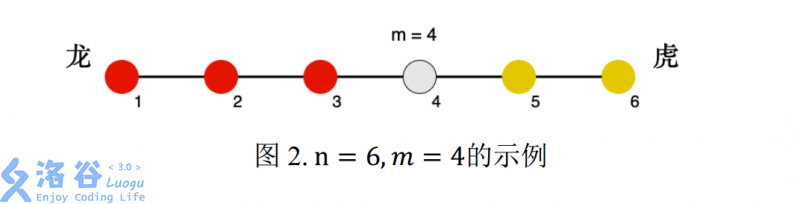 下面图 2为 n=6,m=4的示例,其中红色为龙方,黄色为虎方: