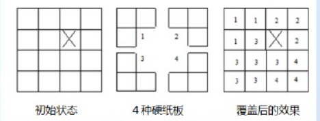 如图所示,有一正方形棋盘,其边长为2^k(1<k<10),其中有一格损坏。现在想用图中间所示形状的硬纸板将没有坏的所有格子盖起来。而硬纸板不得放入坏格中和棋盘外面。编程输出一种覆盖方案,将共用一块硬纸板的三个格子用相同的数字表示。