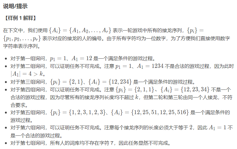 - 接龙的人选择一个长度在[2,k]的sp的连续子序列A作为这一轮的接龙序列,其中k是给定的常数。若这是游戏的第一轮,那么A需要以元素1开头,否则A需要以上一轮的接龙序列的最后一个元素开头。